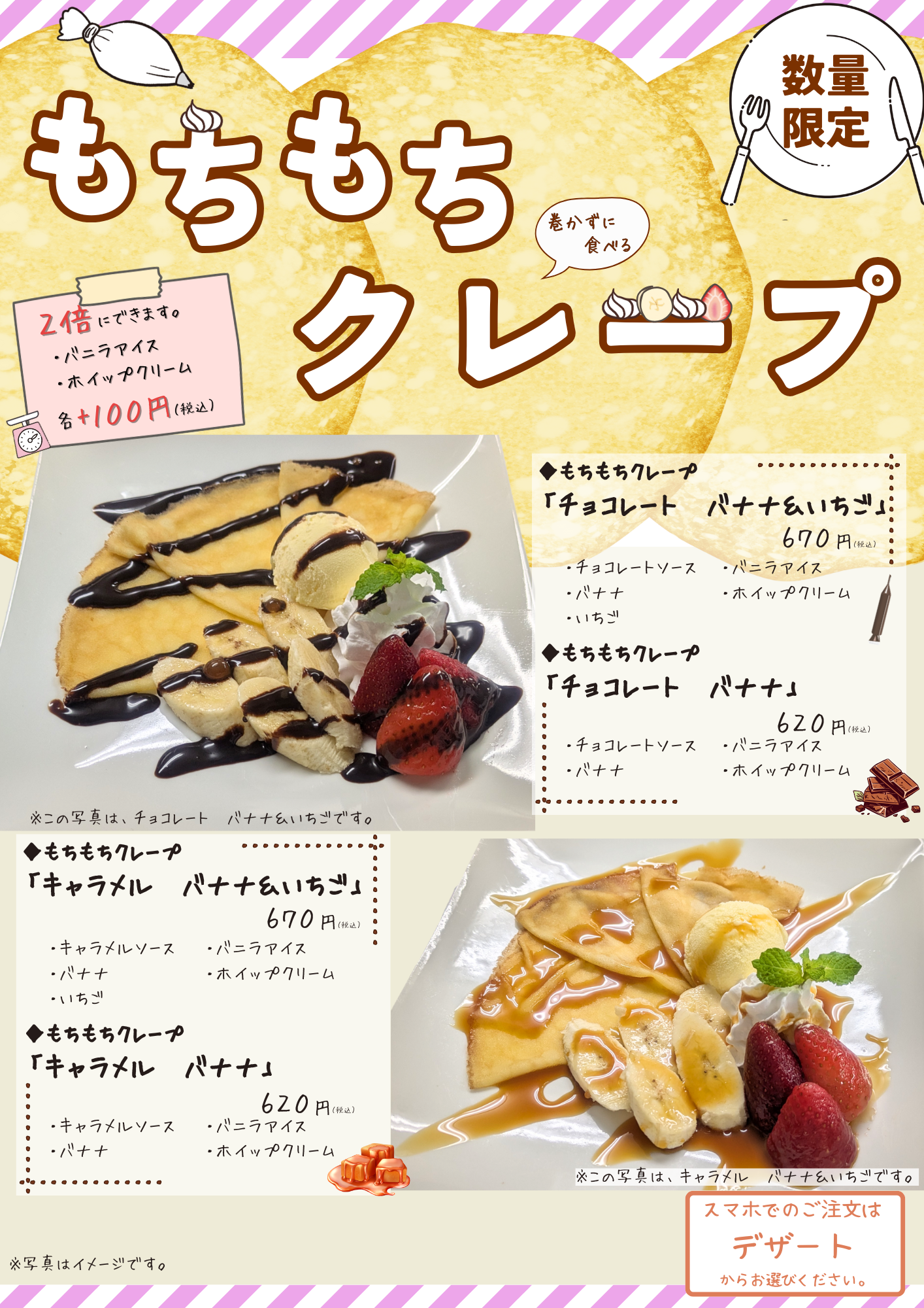 10月1日(水)より新メニュー「もちもちクレープ」の登場です!! おやつ時間におすすめの「もちもちクレープ」を4種類ご用意いたしました。 バナナやいちご、バニラアイス、ホイップクリームとクレープは相性抜群!! 数量限定になりますので、どうぞこの機会にお召し上がりください。 ・チョコレート バナナ 620円(税込) ・キャラメル バナナ 620円(税込) ・チョコレート バナナ&いちご 670円(税込) ・キャラメル バナナ&いちご 670円(税込) ☆バニラアイス、ホイップクリームは2倍にできます! 各+100円(税込)☆ ...