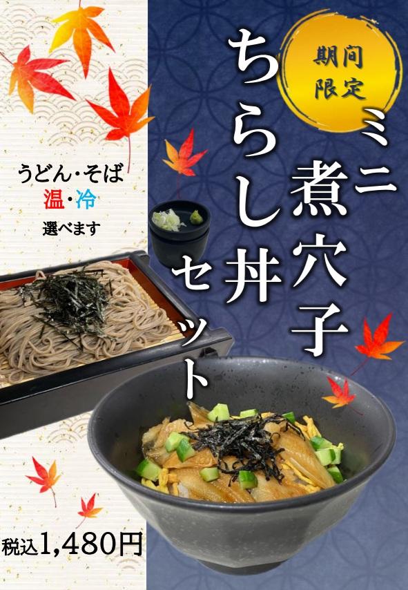 10月1日(水)より、今が旬の穴子を使用した「ミニ煮穴子ちらし丼セット」が新登場! ふっくらと仕上げた煮穴子と、彩り豊かな具材を合わせたちらし丼は、秋の味覚を存分にお楽しみいただける一品です。 セットは、「そば・うどん」、「温・冷」からお好みでお選びいただけます。 食欲の秋にぴったりなおすすめセットを、ぜひご賞味ください。 ...