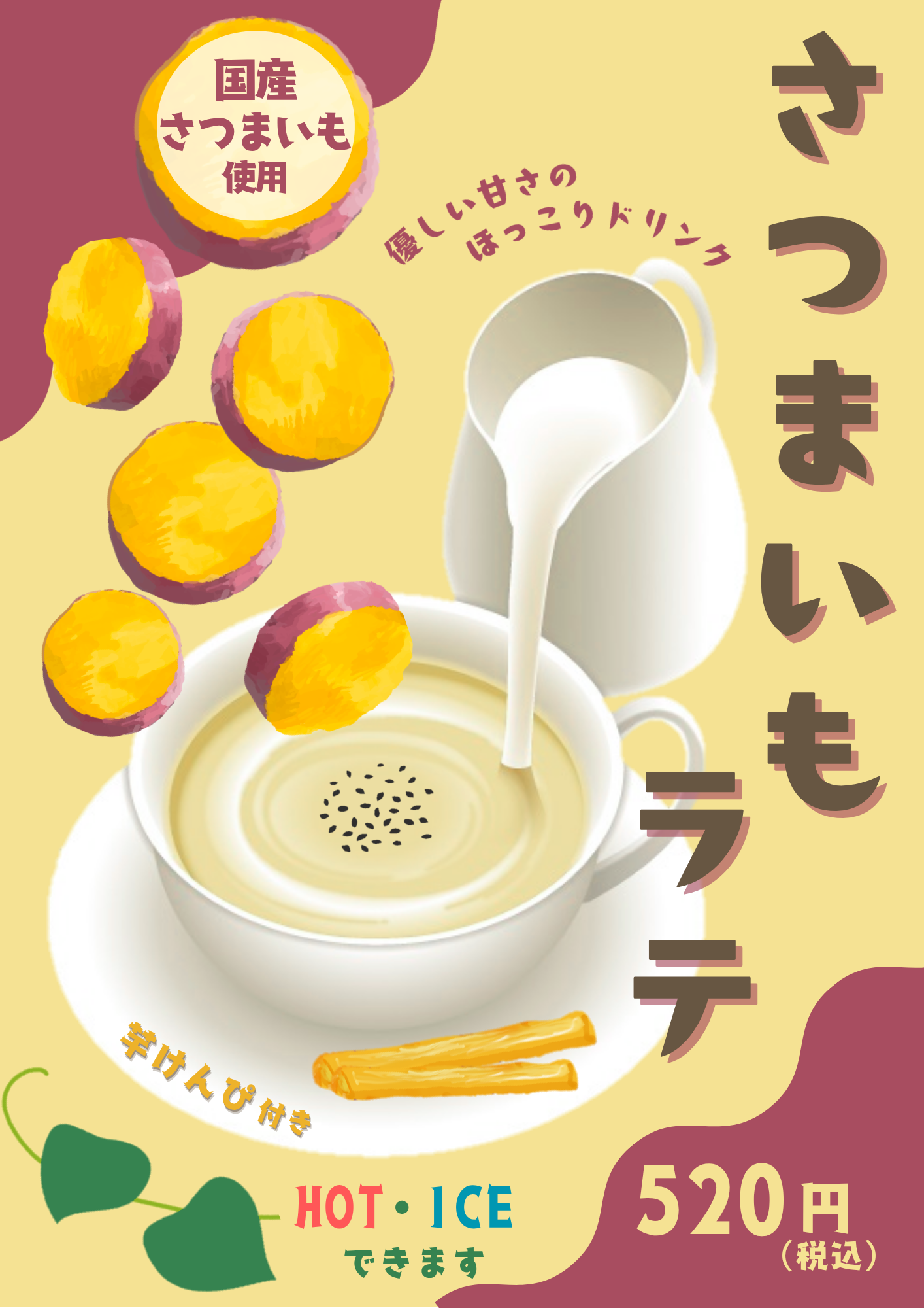 10月4日(土)より新メニュー「さつまいもラテ」の登場です!! 秋におすすめのドリンク「さつまいもラテ」はいかがでしょうか。 国産のさつまいもを贅沢に使用した、優しい甘さのドリンクです!! ホットとアイスからお選びいただけます。芋けんぴと一緒にお楽しみください。...